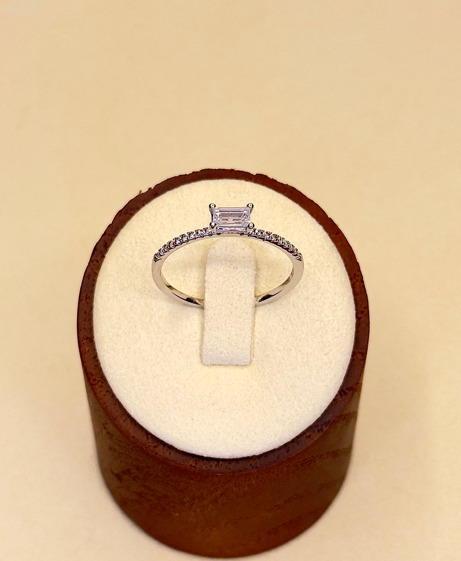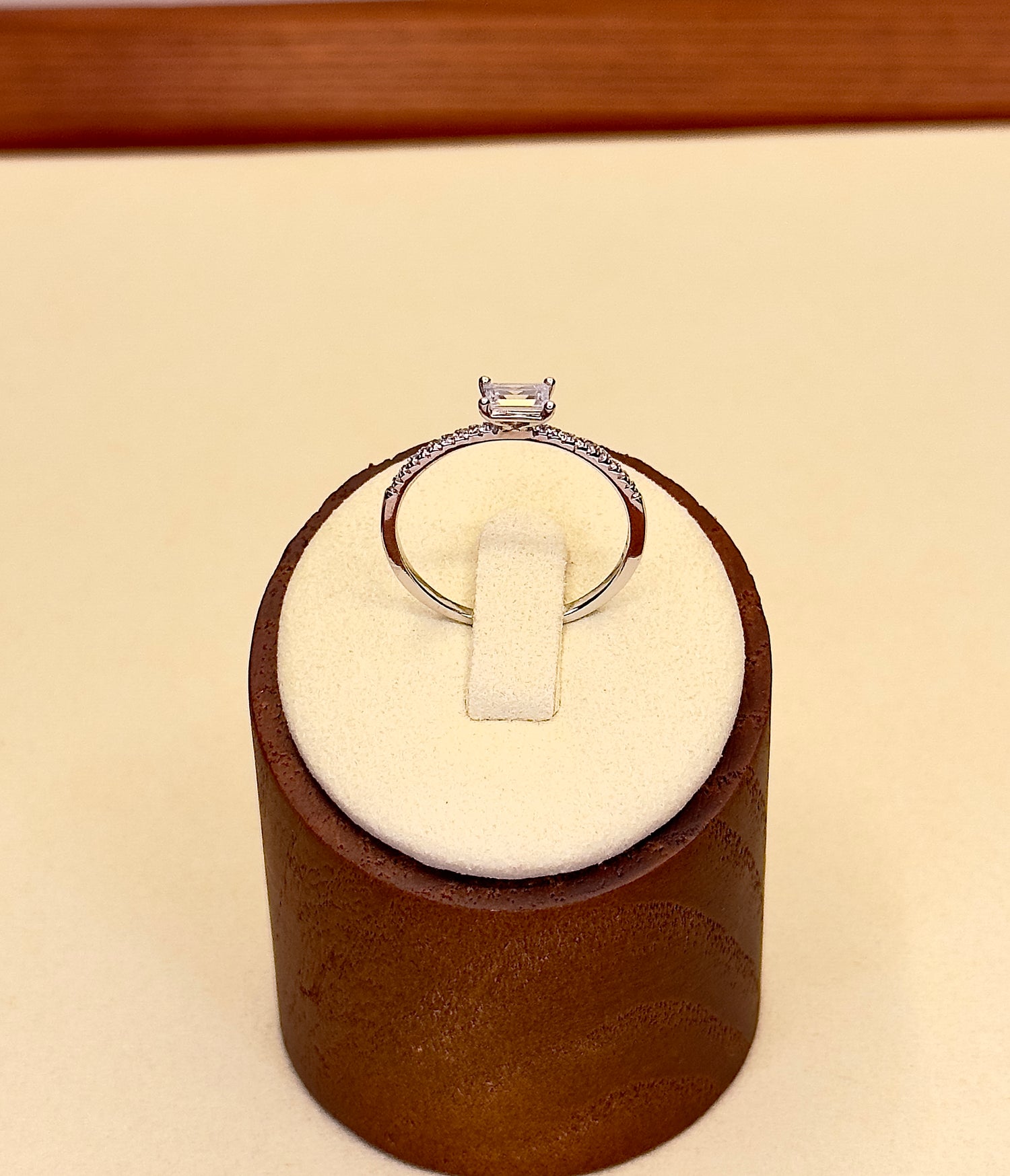 Offering undeniable sparkle and a classy finish, this is a pure 925 sterling silver ring that has a unique baguette centerpiece. The shank of the ring is studded with pavé set dazzling CZ stones that complement the minimalist style of the piece.